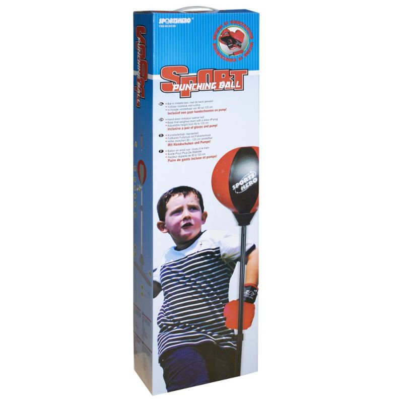 Комплектът съдържа боксова круша на стойка, чифт боксови ръкавици и помпа с игличка. Подходящ за първите стъпки на децата в бокса. Ръкавиците са добре подплатени, с пристягащи ленти около китките. Височина - от 80 до 120 см. Диаметър боксова круша - 18 см. Размер площ за стъпване - 67х18 см. Материал - PU кожа, PVC, метал. Размери на опаковката - 68х19х10 см. Тегло за комплект - 1.9 кг. Подходящ за деца над 6 години.