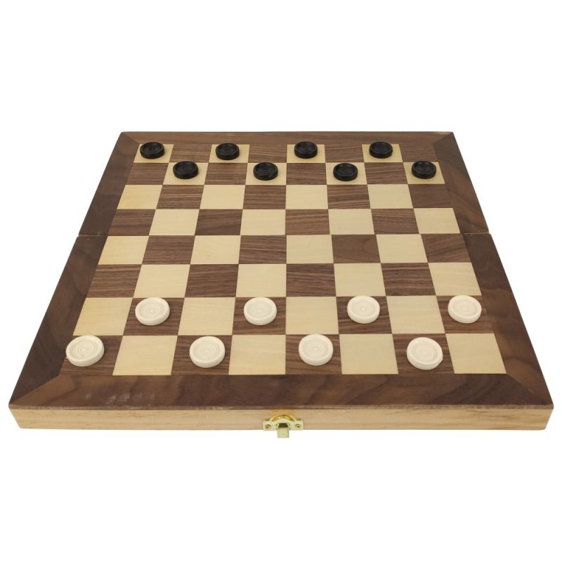 Комплект 3 в 1 класически настолни игри - шах, дама и табла, дървен с инарзия от фурнир. Комплектът съдържа дървена кутия, дървени шахматни фигури с размери от 3 до 7 см, пластмасови пулове с диаметър 2.3 см, пластмасови зарчета. Размер на таблото - 34х34 см. Размер на таблото затворено - 34х17х5 см. Материал дъска и фигури - дървесина. Материал пулове и зарчета - PVC. Размер цар - 7 см. Размер пешка - 3 см. Диаметър пул - 2.3 см. Фигурите за шах разполагат със защитна лепенка от долната страна против плъзгане. Тегло за комплект - 800 г. Дъската е изработена от естествен материал, възможно е да има разлики в нюансите на цветовете на фурнира на отделните квадратчета.