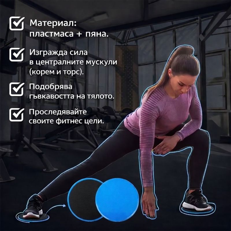 Двустранни фитнес плъзгащи дискове, подходящи за тренировки у дома и във фитнес зала. Идеални за коремни, core и функционални упражнения, като подобряват баланса, стабилността и мускулния контрол. Пластмасовата страна е подходяща за килими/мокети, а меката – за твърди подове. Леки, компактни и удобни за пренасяне, подходящи както за начинаещи, така и за напреднали.
