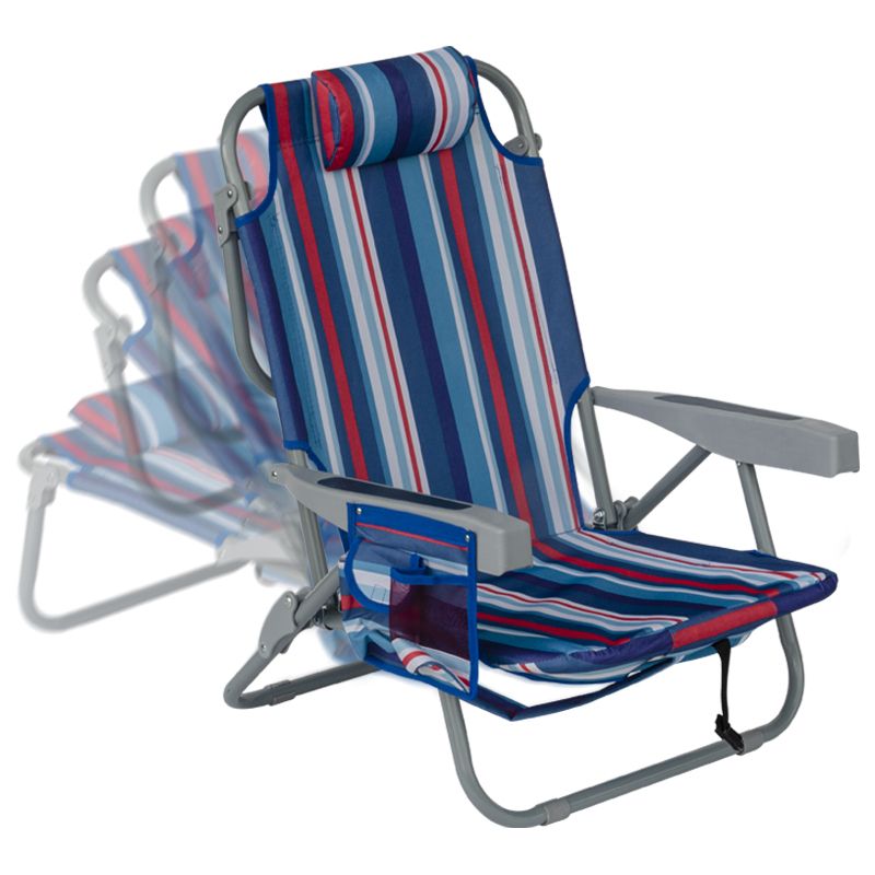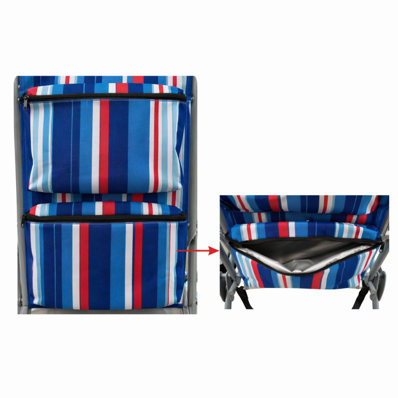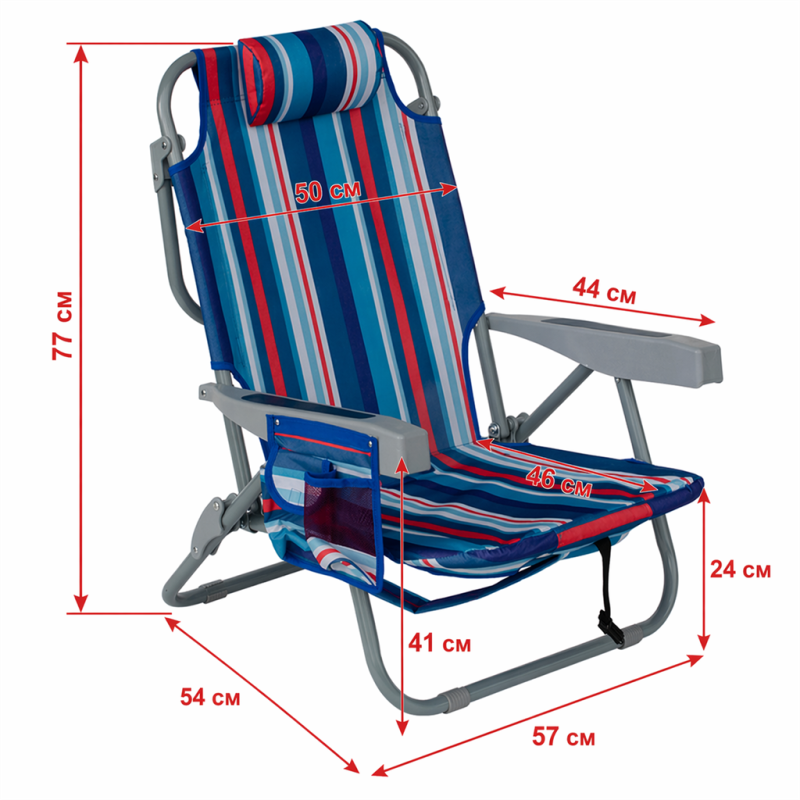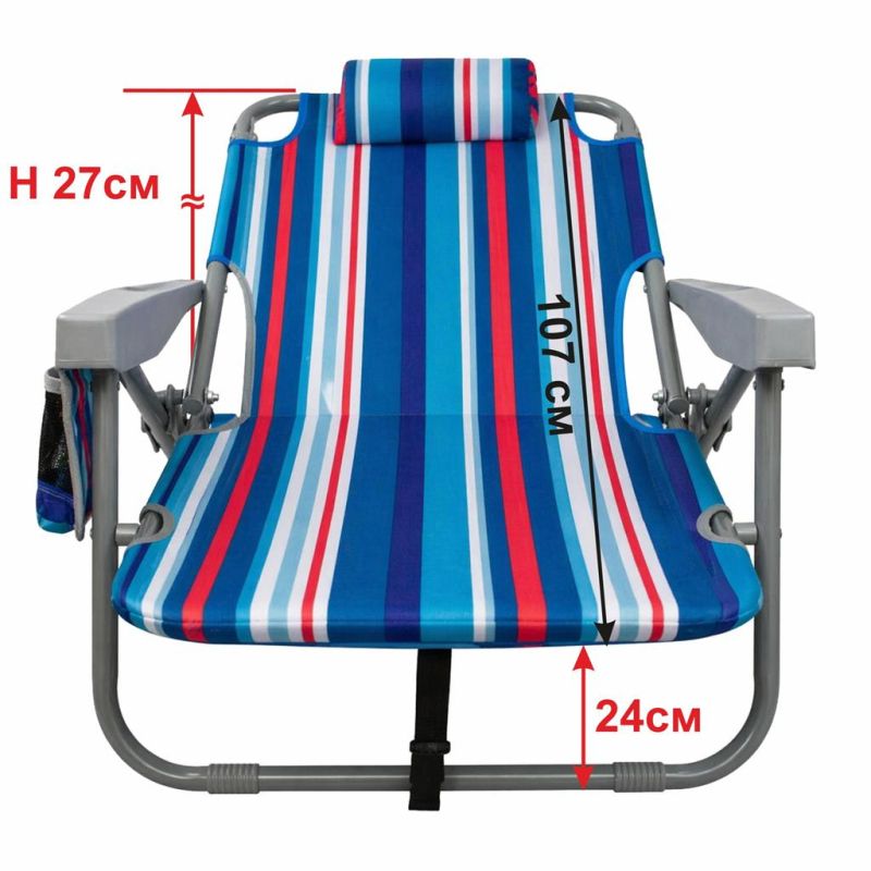 Наслади се на слънчевите дни с този удобен, лек и здрав сгъваем плажен стол, идеален за къмпинг, плаж, пикник или градина. Проектиран с мисъл за мобилност и комфорт, този стол комбинира модерен дизайн, качествени материали и ергономичност, които го правят незаменим аксесоар за всяко лятно приключение. Разполага с възглавница, поставка за чаша / бутилка, малък джоб с велкро лепенка, голям джоб с цип на гърба и хладилен джоб с цип отново на гърба. Възможност за промяна наклона на облегалката в 5 различни положения. Изработен от здрава стоманена рамка с диаметър 23 мм и издръжлив на различни атмосферни влияния полиестерен плат Oxford 600D, които предоставят стабилност и комфорт. Столът се сгъва и разгъва лесно и бързо. Разполага с дръжка и с презрамки, които дават възможност да бъде носен като раница. Максимална височина облегалка в положение стол – 77 см. Минимална височина облегалка в положение шезлонг – 27 см. Размери седалка – 46х50 см. Височина седалка – 24 см. Дължина подлакътник – 44 см. Ширина стол с подлакътниците – 59 см. Заемана подова площ – 57х54 см. Размери възглавница – 23х12х6 см. Тегло – 3.6 кг. Размери сгънат - 74х63х11 см. Материал – стомана, полиестерен плат Oxford 600D. Максимално натоварване - 110 кг.