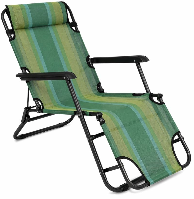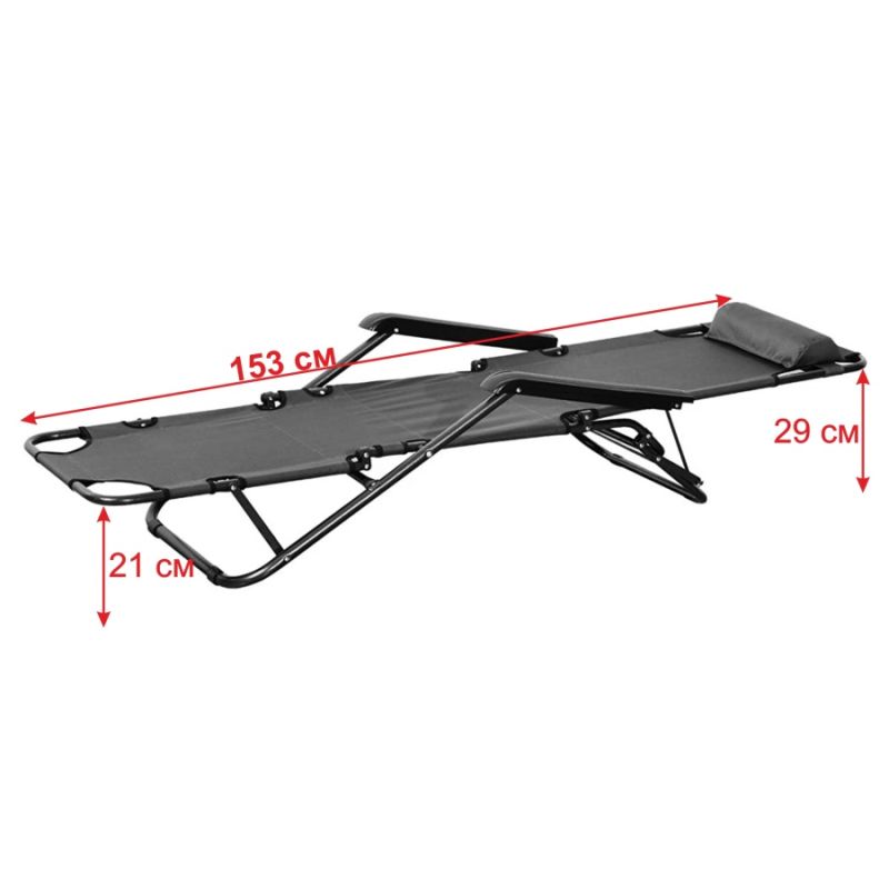 Сгъваем стол шезлонг - разгъва се до походно легло с дължина 153 см, с възглавничка за главата. Здрав и устойчив на различни атмосферни условия, поради факта, че е изработен от стомана и textilene - мрежест, дишащ, здрав, бързосъхнещ материал, което прави стола подходящ за градина, тераса, плаж, къмпинг. Многофункцинален, лек и компактен. Лесно сгъване, разгъване и преминаване от една функция в друга. Дължина - 153 см. Ширина за сядане - 47 см. Ширина с подлакътниците - 60 см. Дължина подлакътник - 49 см. Размери сгънат - 89х60х12 см. Дебелина тръба - Ф20 мм и Ф25 мм. Размери възглавница - 33х12х6 см. Тегло - 4.5 кг. Максимално натоварване - 90 кг. Материал - стоманена рамка, textilene. Височината на седалката в положение стол е 30 см в задния край и 45 см в предния. Височината на седалката в положение шезлонг е 17 см в задния край и 27 см в предния. Височината в положение легло в трите секции е съответно 21 см, 23 см и 29 см.