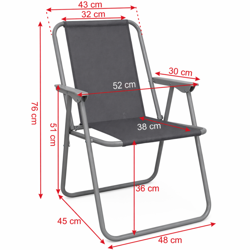 Лек, компактен и удобен сгъваем стол за използване на открито. По-здрав и устойчив на различни атмосферни условия, поради факта, че е изработен от стомана и полиестер Oxford, което прави стола подходящ за градина, тераса, плаж, къмпинг. Височина облегалка - 76 см. Височина седалка - 36 см. Размери седалка - 43х38 см. Дължина подлакътник - 30 см. Ширина стол с подлакътниците - 52 см. Заемана подова площ - 48х45 см. Размери сгънат - 67х52х5 см. Тръбна стоманена рамка с диаметър - Ф18 мм. Тегло на стола - 1.9 кг. Максимално натоварване - 90 кг.
