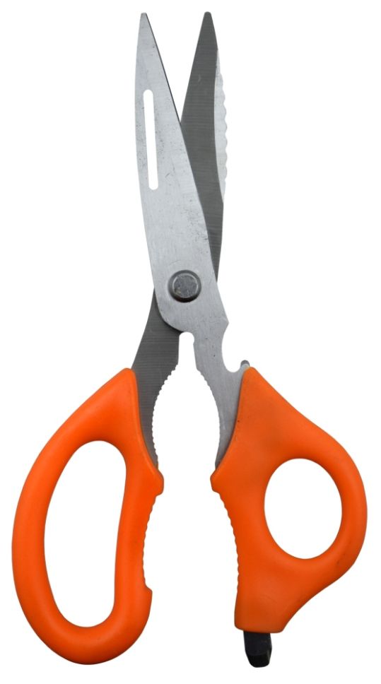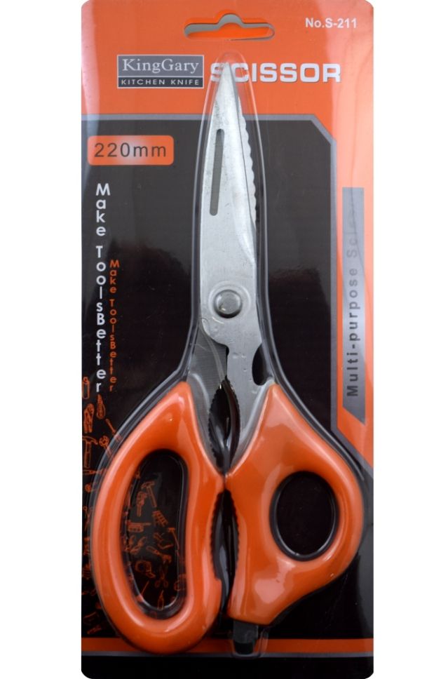 Многофункционална домакинска ножица, 22 см. Подходяща употреба в кухнята, градината, колата, офиса, гаража или работилницата. Ножицата има приставки за отваряне на бутилки и малки буркани, за чупене орехи и може да реже всичко - от месо, риба и зеленчуци до плат, тънка тел, кабели, растения и др.