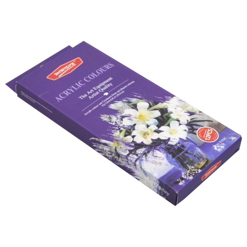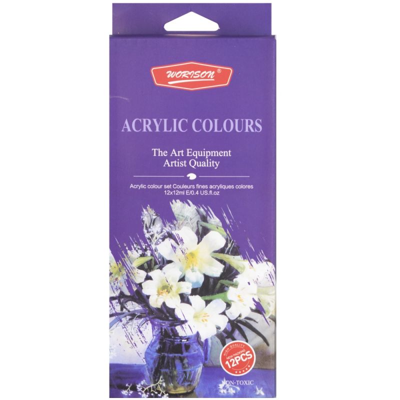 Акрилни бои MAXIMA, 12 цвята, В туби. Подходящи за употреба у дома, в училища и детски градини. Произведени от висококачествени материали. Живи и ярки цветове, отлична покривна способност и висока плътност на цветовете. Нетоксични. Обем туба - 12 мл. Тегло за комплект - 230 г. Размери опаковка - 25х10.5х2 см.