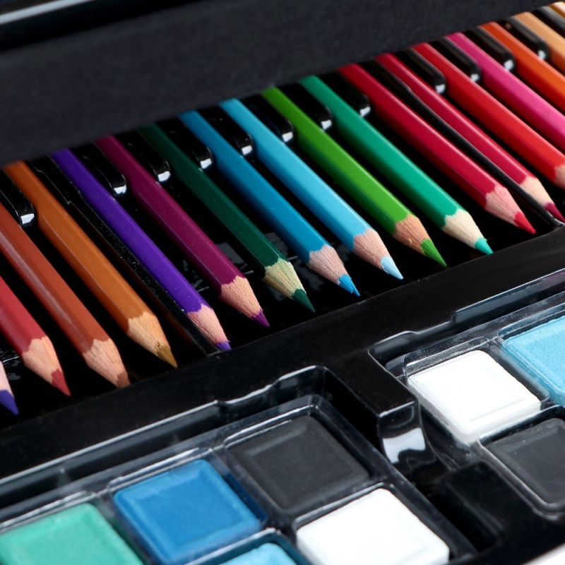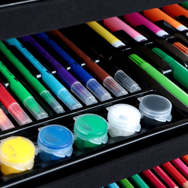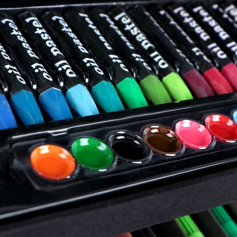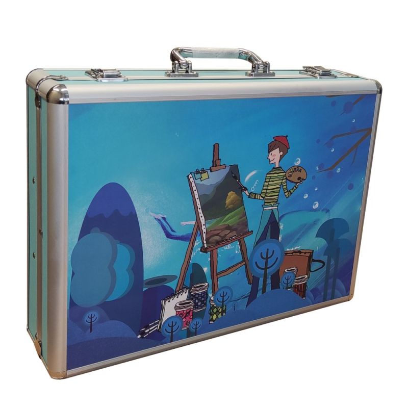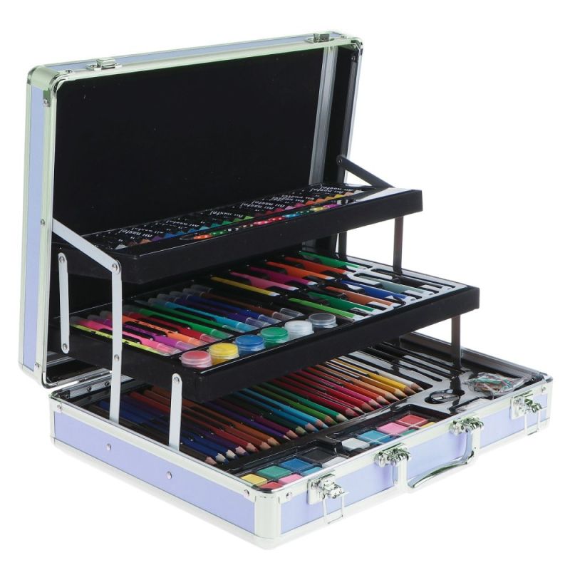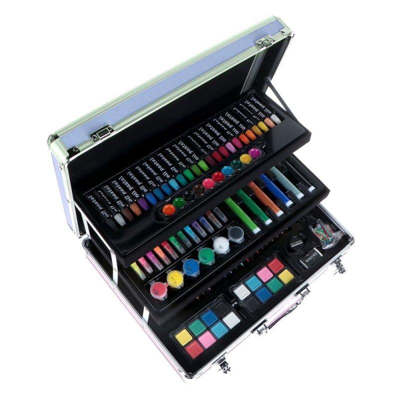 Рисувателен комплект 158 части в куфарче с дръжки за удобно съхранение и пренасяне. Стимулира въображението и артистичното развитие на децата. Металните ръбове предпазват съдържанието от повреда. Металните катарами затварят здраво куфара. Плъзгащите се (разгръщащи се) отделения предоставят удобство по време на употреба. Съдържа:- 24 цвята маслени пастели;- 10 цвята бои меден акварел;- 12 цвята двувърхи маркери за рисуване (разполагат с по два върха – объл и връх тип четка);- 12 цвята акварелни флумастри;- 6 цвята темперни бои;- 24 цвята моливи;- 3 броя обли четки;- 2 броя чернографитни молива HB;- 16 цвята водни бои;- 1 брой гума;- 1 брой острилка;- 27 броя кламери;- 18 картини за оцветяване;- 1 шаблон с английски букви, цифри и аритметични знаци;- 1 куфар, в който са наредени всички пособия. Размери куфар – 38х30х10 см. Материал – PVC, метал. Тегло за комплект – 2 кг.