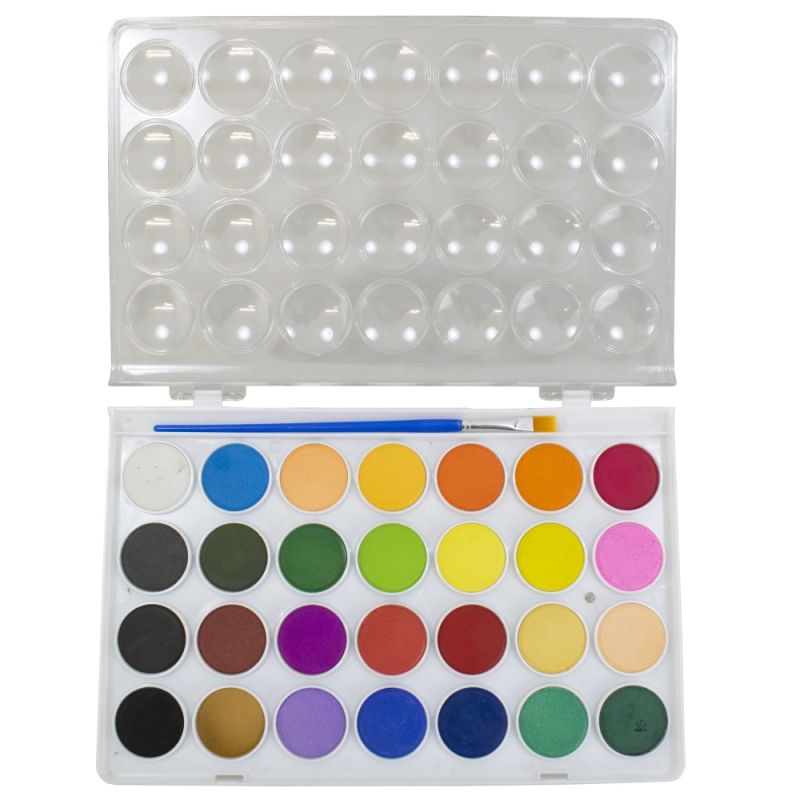 Водни бои MAXIMA, 28 цвята. Произведени от висококачествени материали с органични пигменти, нетоксични. Живи, ярки и плътни цветове, отлична покривна способност. Кутия с прозрачен капак. Капакът на кутийката на боите може да се използва като палитра. Подходящи за употреба у дома, в училища и детски градини. Материал – PVC. Размери на кутията - 24х16х1.5 см. Диаметър таблетка – 3 см. Тегло – 260 г.