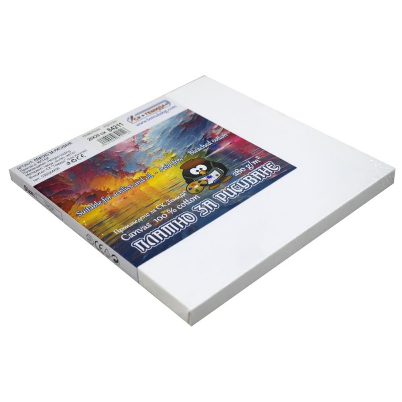 Платно на рамка с размери 20x20 см. Платното е изработено от памучна канава, опъната върху дървена рамка. Върху платното може да се използват различни видове бои. Дебелина на рамката - 1.5 см. Размер платно - 20х20 см. Дебелина платно - 280 г / кв.м. Тегло - 115 г. Материал - дървесина, избелена памучна канава.