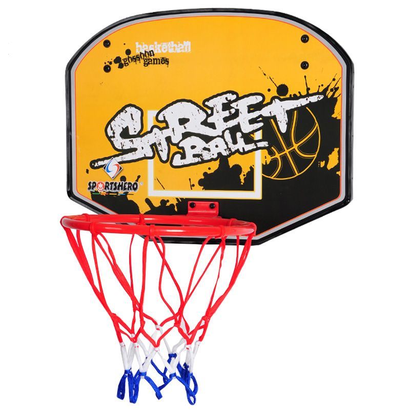 Баскетболно табло с кош за деца. За монтиране на стена, врата или друга стабилна повърхност (комплектът съдържа необходимите елементи за монтаж). Комплектът включва мрежа, демонстрационна топка и помпа. Игличката на помпата се намира в дръжката. Размери табло - 49x38 см. Вътрешен диаметър ринг - 25 см. Размери опаковка - 50х38.5х3 см. Тегло за комплект - 1.9 кг. Материал - MDF, метал, пластмаса.