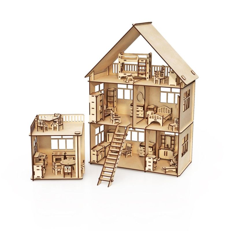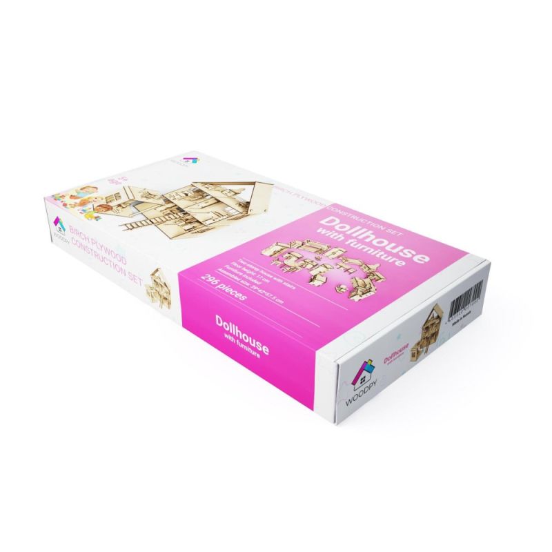 Дървена къща за кукли на три етажа напълно обзаведена с мебели и с пристройка. Сглобяем комплект, направен изцяло от естествен материал – бреза. Всеки елемент е изработен чрез технологията на лазерно рязане, осигуряваща прецизност на размерите и гладкост на елементите (Елементите предварително са отрязани в дъската и лесно се изваждат). Сглобяването е без лепило и ножици, елементите само се щракват един в друг - щифтът се закрепя в улея. Всеки комплект съдържа подробна и ясна инструкция за сглобяване с картинки. Може да се използват бои и да се оцветят елементите. Продуктите са приятни на допир и миришат хубаво. Сглобяемите комплекти WOODPY развиват креативност, памет, когнитивни умения, концентрация и умения за фина моторика у децата. Височина на етажа - 17 см. Материал – дърво от Бреза. Сглобен размер - 39x42x57.5 см. Размер на опаковката - 400х20х54 мм. Тегло - 2.8 кг. Подходящи за деца над 5 години.