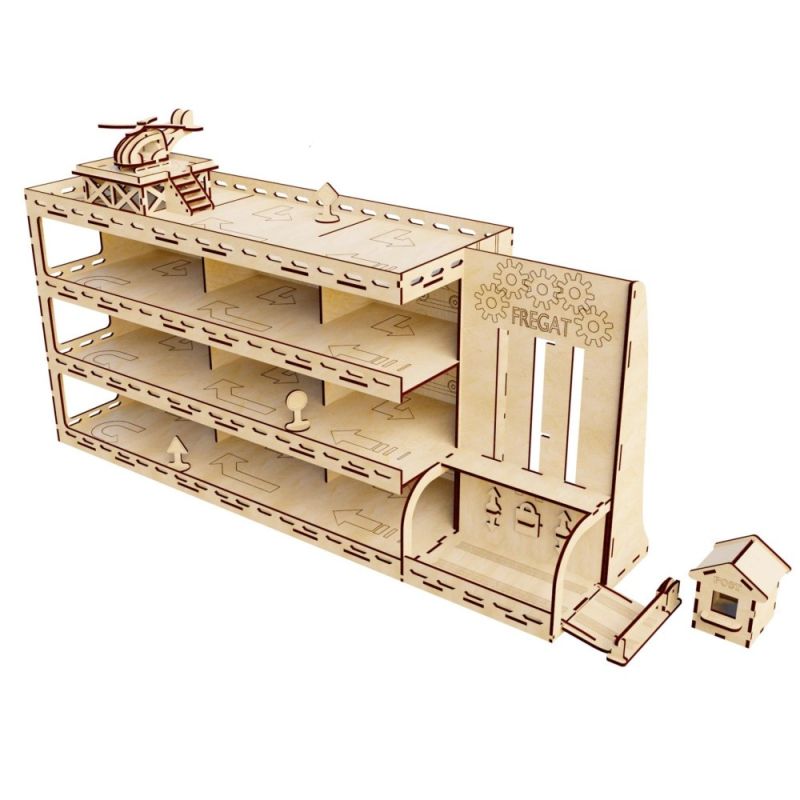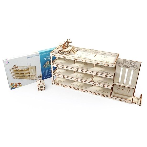 Паркинг на четири етажа. Включва хеликоптер, пътни знаци, бариера и пункт за охрана. Паркингът е оборудван с повдигащ механизам. Сглобяем комплект, направен изцяло от естествен материал – бреза. Всеки елемент е изработен чрез технологията на лазерно рязане, осигуряваща прецизност на размерите и гладкост на елементите (Елементите предварително са отрязани в дъската и лесно се изваждат). Сглобяването е без лепило и ножици, елементите само се щракват един в друг - щифтът се закрепя в улея. Всеки комплект съдържа подробна и ясна инструкция за сглобяване с картинки. Може да се използват бои и да се оцветят елементите. Продуктите са приятни на допир и миришат хубаво. Сглобяемите комплекти WOODPY развиват креативност, памет, когнитивни умения, концентрация и умения за фина моторика у децата. Материал – дърво от бреза. Сглобен размер - 61x20x26 см. Размер на опаковката - 430х230х30 мм. Тегло - 2.0 кг. Подходящи за деца над 5 години.