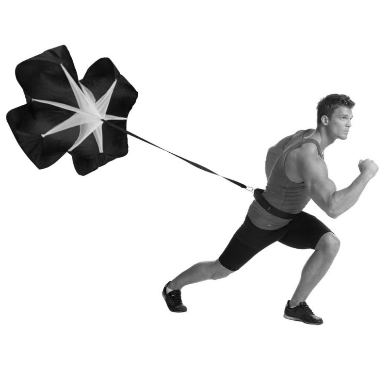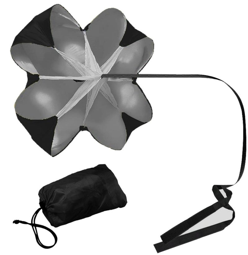Тренировъчният парашут създава допълнително съпротивление на бягащия. Продуктът е подходящ за постигане на по-добри резултати в бягането, независимо какъв спорт се практикува. С негова помощ се увеличава скоростта, ускорението и издръжливостта при спринт и други бегови упражнения. Подобрява силата и издръжливостта на краката. Комплектът включва чанта за съхранение и пренасяне. Размери парашут - 100х100 см. Регулируема обиколка на колана от 72 до 114 см. Тегло с опаковката - 250 г. Материал - текстил, PVC.