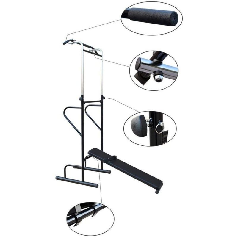 Многофункционален уред, който дава възможност за много и различни упражнения - коремни преси, набиране, кофички, повдигане на крака от вис, упражнения за трицепс, лицеви опори (в основата си уредът разполага с дръжки за лицеви опори). Подходящ за тренировки на мускулите на гърдите, ръцете, гърба, раменете, корема. Прахово боядисана стоманена рамка. Две нива на наклон на лежанката. Височина лост - 150-220 см със 7 различни нива. Дължина лост - 108 см с два варианта за захват. Заемана подова площ без лежанка - 70х63 см. Заемана подова площ с лежанка - 150х63 см. Размери лежанка - 110х25х4 см. Куки за лост с дебелина от 25 мм до 30 мм. Размери кашон - 122х38х15 см. Тегло нето - 18 кг. Тегло бруто - 19 кг. Диаметър профил - 25 мм, 35 мм, 50 мм. Височина напречна греда за трицепс - 36 см.