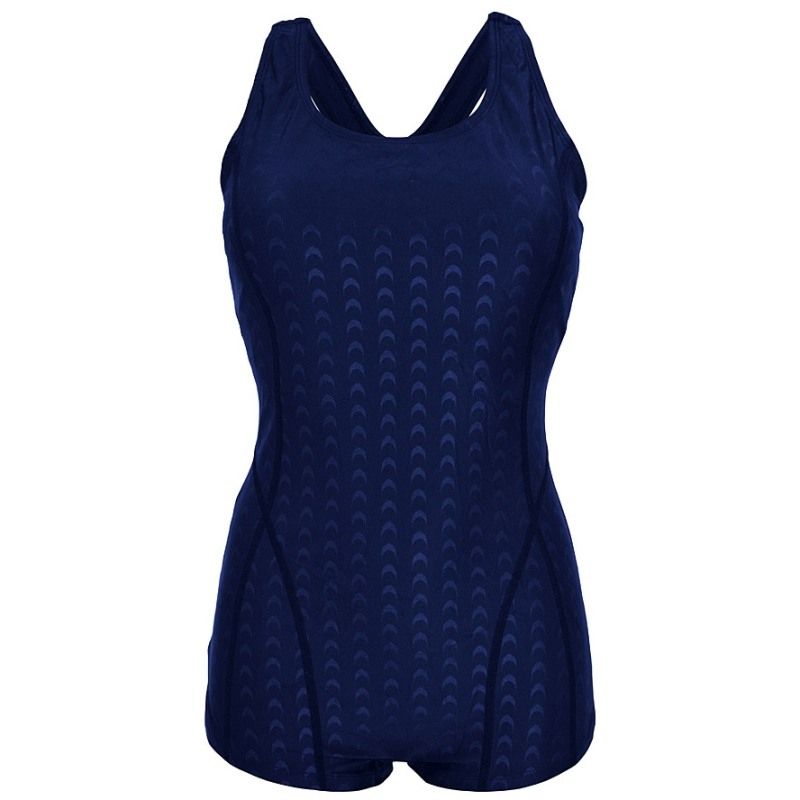 Дамски плувен костюм цял, подходящ за спорт. Кройката и меката и еластична материя осигуряват комфорт и свобода на движенията при интензивни тренировки по водни спортове – плуване, водна аеробика. Кройка – широки презрамки, широк отвор на гърба, боксер. Материя – 100 % водоотблъскваща, състав – 82 % полиамид, 18 % еластан.