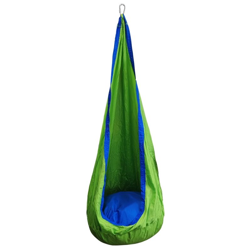 Висящият стол, хамак тип люлка, наподобяващ „гнездо“ или „хралупа“ предлага гостоприемно и уютно място за игра, учене, четене или сън. Изработен е от здрав парашутен плат, устойчив на атмосферни влияния. Подходящ за дома, терасата или градината. Сгушени в меката тъкан, върху голямата и пухкава възглавница, може да намерите тишина и уединение. Нежното люлеещо движение стимулира чувството за равновесие и оказва положително въздействие на способността за концентрация при четене. Комплектът съдържа хамак, надуваема възглавница, помпа, ремък, карабинер и планка с анкерни болтове за окачване. Размери - 150 х Ф60 см. Дължина ремък - от 80 см до 145 см. Ширина ремък - 5 см. Материал - полиестер. Тегло за комплект - 1 кг.
