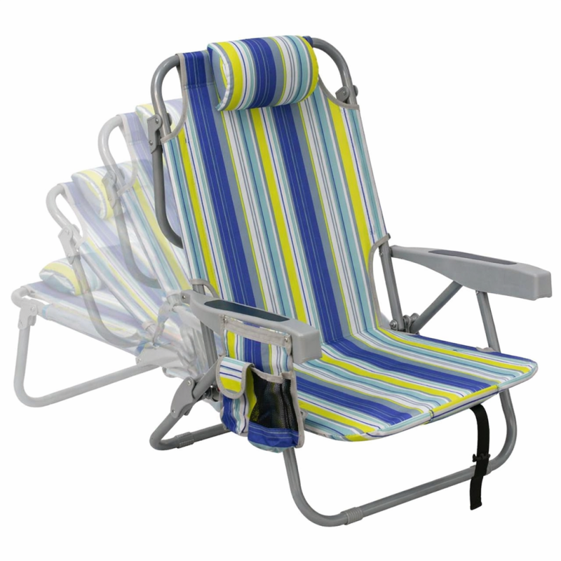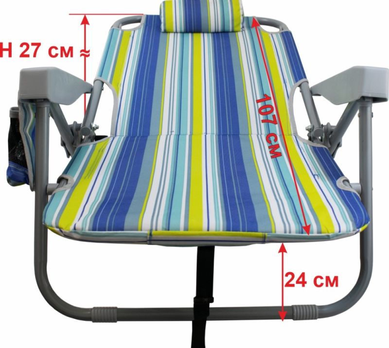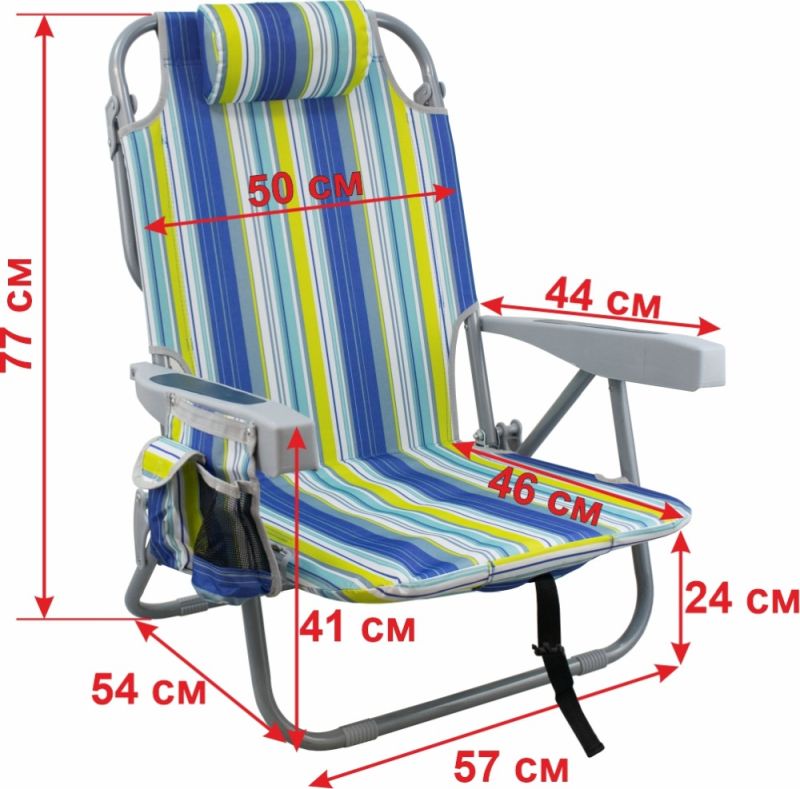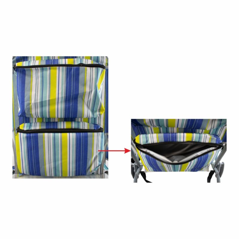 Наслади се на слънчевите дни с този удобен, лек и здрав сгъваем плажен стол, идеален за къмпинг, плаж, пикник или градина. Проектиран с мисъл за мобилност и комфорт, този стол комбинира модерен дизайн, качествени материали и ергономичност, които го правят незаменим аксесоар за всяко лятно приключение. Разполага с възглавница, поставка за чаша / бутилка, малък джоб с велкро лепенка, голям джоб с цип на гърба и хладилен джоб с цип отново на гърба. Възможност за промяна наклона на облегалката в 5 различни положения. Изработен от здрава стоманена рамка с диаметър 23 мм и издръжлив на различни атмосферни влияния полиестерен плат Oxford 600D, които предоставят стабилност и комфорт. Столът се сгъва и разгъва лесно и бързо. Разполага с дръжка и с презрамки, които дават възможност да бъде носен като раница. Максимална височина облегалка в положение стол – 77 см. Минимална височина облегалка в положение шезлонг – 27 см. Размери седалка – 46х50 см. Височина седалка – 24 см. Дължина подлакътник – 44 см. Ширина стол с подлакътниците – 59 см. Заемана подова площ – 57х54 см. Размери възглавница – 23х12х6 см. Тегло – 3.6 кг. Размери сгънат - 74х63х11 см. Материал – стомана, полиестерен плат Oxford 600D. Максимално натоварване - 110 кг.
