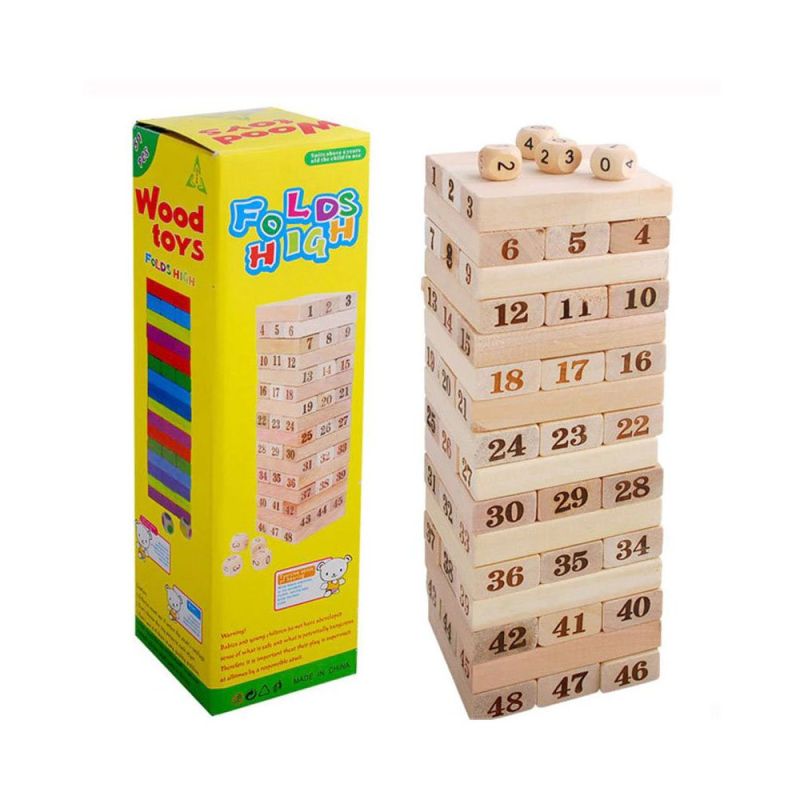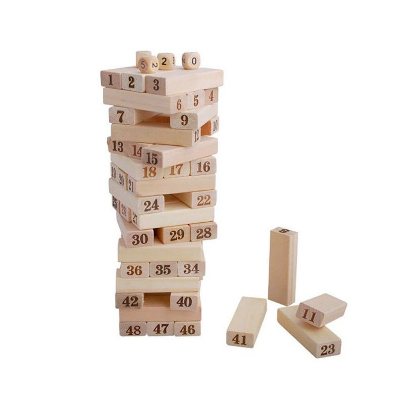 Дженга - дървена забавна игра с числа. Целта на играта е да бъде подредена колкото е възможно по-висока кула от дървените елементи. Всеки играч трябва да изкара елемент от долната част на кулата и да я добави най-отгоре. Играчът, който събори кулата, губи играта и подрежда кулата за следващата игра. Играта е еднакво забавна и интересна както за деца, така и за възрастни. При игра на дженга се изисква добра координация и концентрация, което я прави изключително полезна за подрастващи. Комплектът съдържа 48 плочки и 4 зарчета. Размер плочка - 7.5х2.5х1.5 см. Страна на зарче - 1.5 см. Тегло нето - 800 г. Тегло бруто - 850 г. Размери кутия - 26х8х8 см. Подходяща за деца над 8 години.