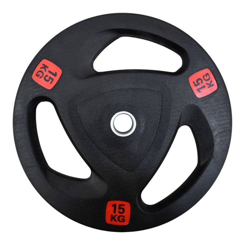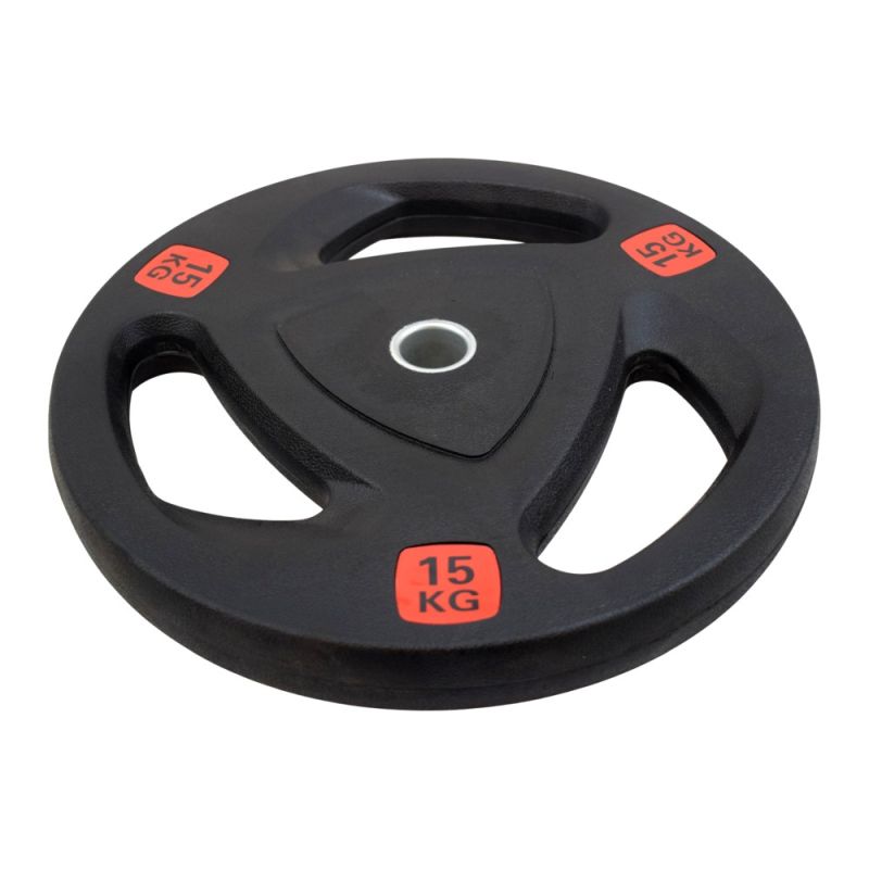 Диск за щанга MAXIMA, 15 кг, гумиран, с метален пръстен и дръжки. Подходящ за домашна употреба. Лесен за поддръжка. Диаметър на отвора 30 мм, което го прави подходящ за лостове с дебелина от 25 до 28 мм. Размери диск – Ф36x4 см. Цената е за един диск.