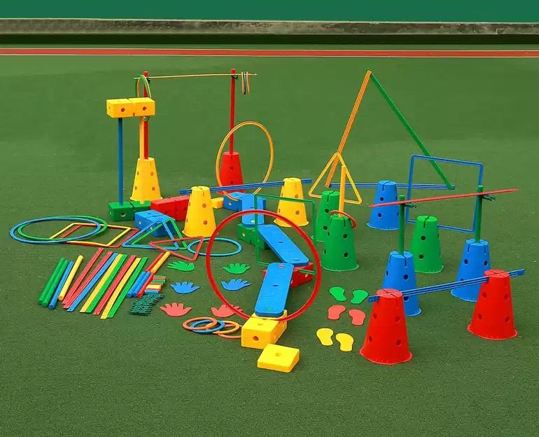 Игрален комплект конструктор 120 елемента. Комплектът съдържа: <br> 1. Отпечатъци на стъпки - 3 чифта с дължина 22 см; <br> 2. Отпечатъци на длани - 3 чифта с дължина 19 см; <br> 3. Тояжки обли - 4 броя с дължина 71 см и диаметър 28 мм; <br> 4. Тояжки обли - 8 броя с дължина 35.5 см и диаметър 28 мм; <br> 5. Тояжки обли - 17 броя с дължина 7 см и диаметър 28 мм; <br> 6. Плоски тояжки - 16 броя с дължина 98 см и ширина 3 см; <br> 7. Двойни блокчета – 8 броя с размер 30х15х10 см и отвори за тояжки от 6 страни; <br> 8. Дъски за равновесие – 3 броя с размер 80х15х2.5 см с по 3 отвора за тояжки; <br> 9. Капаци – 2 броя с размери 16х15х5.5 см с по един отвор за тояжки; <br> 10. Конуси с отвори за тояжки и прорези за плоски обръчи - 12 броя с височина 31 см; <br> 11. Плоски кръгли обръчи – 18 броя, от които 4 с диаметър 68 см, 4 с диаметър 38.5 см и 10 с диаметър 17 см; <br> 12. Плоски квадратни обръчи – 4 броя с размери 43х43 см; <br> 13. Плоски триъгълни обръчи – 4 броя с размери 37х37х37 см; <br> 14. Свързващи елементи за тояжки и / или плоски рингове с възможност за завъртане на 360 градуса – 12 броя. <br> Комплектът дава възможност за изграждане на обемни фигури, което развива въображението, сръчността и координацията на децата. Подходящ за употреба в детски градини и училища. Материал – PVC. Тегло нето – 22.9 кг. Тегло бруто – 23.9 кг. Размери кашон - 97х72х25 см.