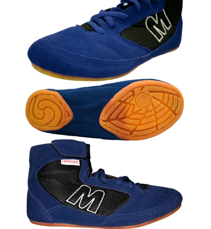 Обувки за борба - борцовки. Подходящи за тренировки и състезания. Подметката е разделена на две за повече гъвкавост и свобода на движението. Обувките се предлагат в текстилна торба в същия цвят. Цвят - син. Материал - велур от телешка кожа.